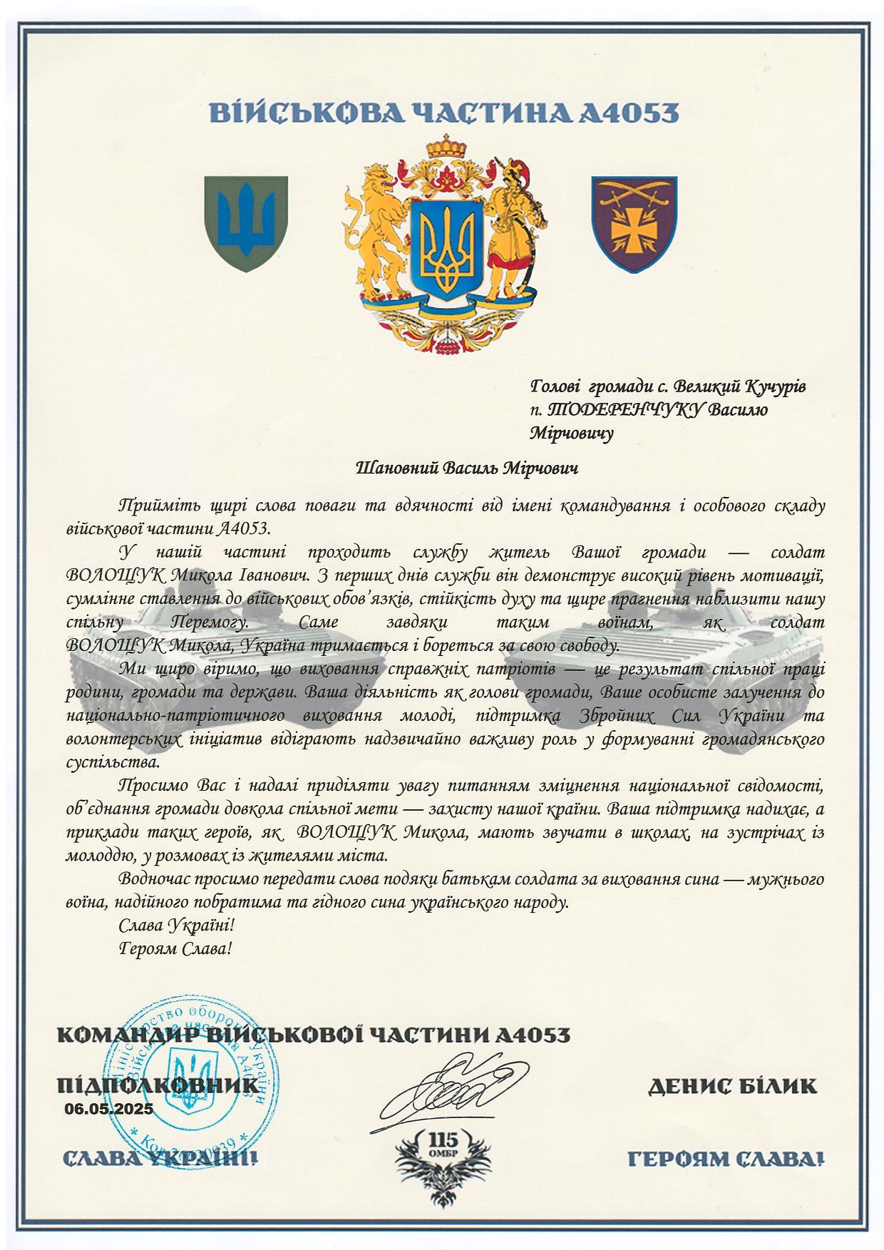 До Великокучурівської сільської ради надійшов офіційний лист-подяка від командира військової частини А4053, підполковника Дениса Білика, де висловлюється щира вдячність за відважну службу солдата ВОЛОЩУКА Миколи Івановича — жителя нашої громади. Керівництво військової частини відзначає високий рівень мотивації, сумлінне ставлення до військових обов’язків, стійкість духу та щире прагнення наблизити нашу спільну Перемогу.