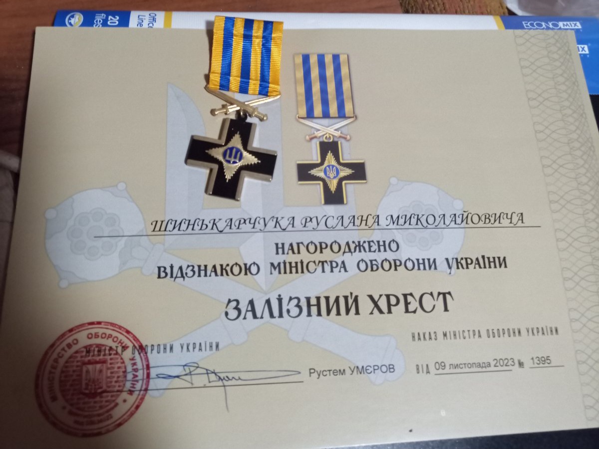 Шинькарчука Руслана Миколайовича нагороджено відзнакою міністра оборони України « Залізний хрест» відзнака якою нагороджений Руслан це одна з найпрестижніших нагород, що символізує високий професіоналізм та непохитність українських захисників.